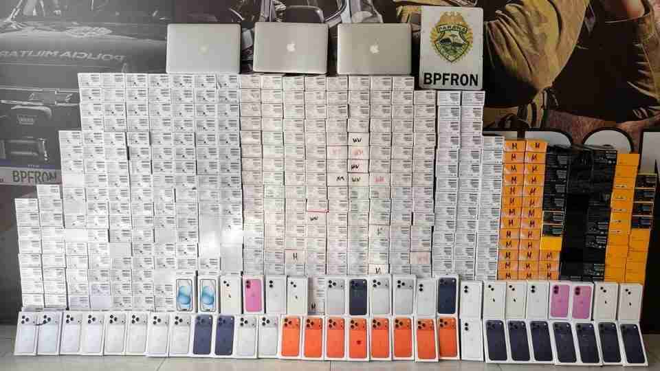 Durante a abordagem, policiais do Batalhão de Polícia de Fronteira (BPFron) localizaram 589 smartphones de diferentes marcas e três computadores MacBook escondidos na cabine e em compartimentos anexos do veículo. Como não havia documentação que comprovasse a importação regular, o caso foi enquadrado como crime de descaminho.