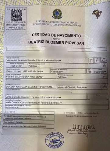 A certidão de nascimento da pequena Beatriz Blumer Piacentini traz um detalhe incomum: o local de nascimento está registrado como BR-467, em Cascavel, no oeste do Paraná. A bebê veio ao mundo dentro do carro da família após a mãe entrar em trabalho de parto durante o trajeto até o hospital.