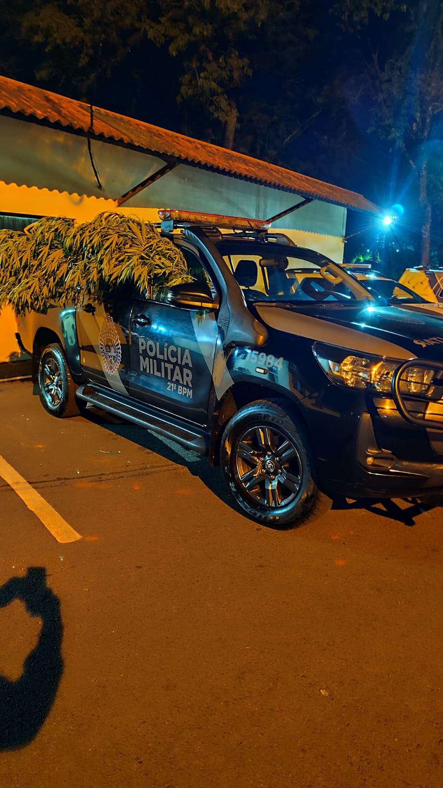 Ainda durante a ação, os policiais visualizaram no local três pés de maconha de grande porte e um de pequeno porte. O responsável pelo imóvel onde as plantas estavam não foi localizado. Questionado, o suspeito alegou apenas que teria fugido por medo.