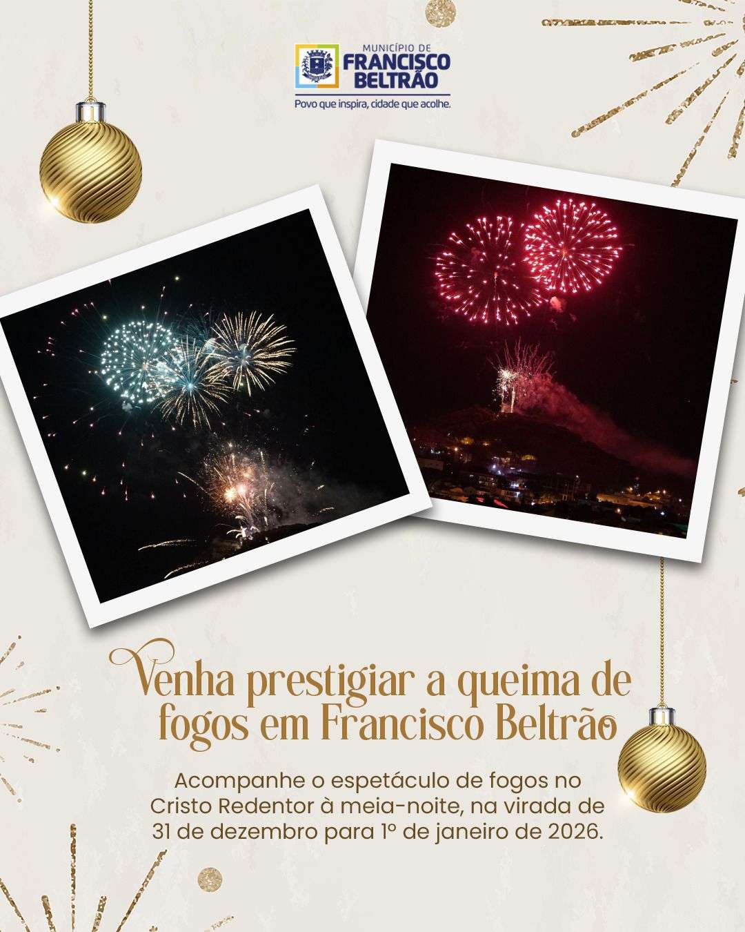 A queima de fogos no Cristo Redentor já faz parte do calendário afetivo do município e reforça o sentimento de pertencimento e renovação. Ao iluminar o céu na virada do ano, o espetáculo simboliza novos começos, sonhos renovados e a certeza de que, com trabalho e união, Francisco Beltrão continuará avançando.