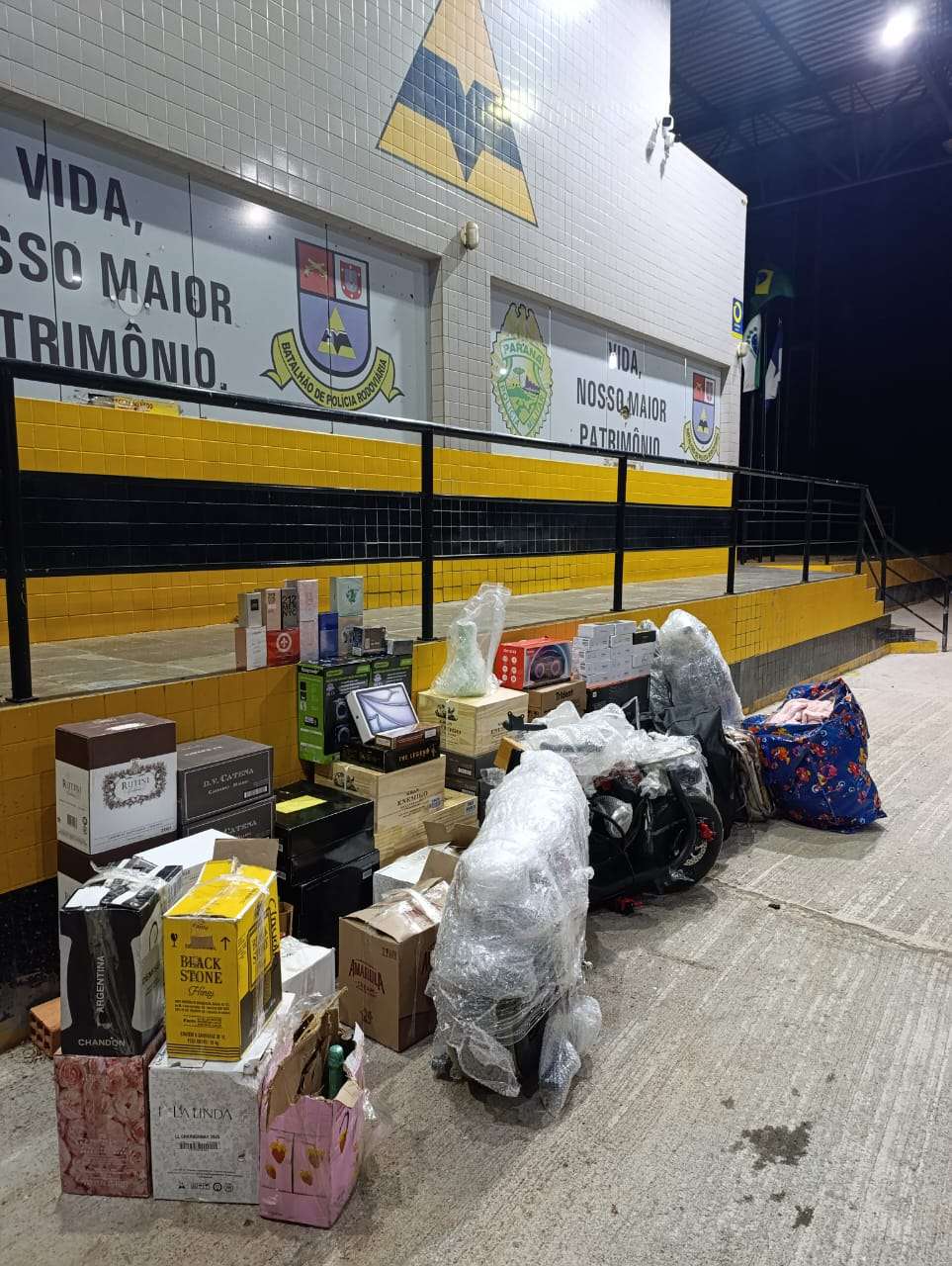 Durante a abordagem, os policiais interceptaram um utilitário que transportava uma carga proveniente de Ciudad del Este, no Paraguai, contendo bebidas alcoólicas acima da cota permitida, eletrônicos, itens de mobilidade elétrica e produtos restritos. Os ocupantes do veículo apresentaram versões contraditórias sobre a propriedade dos itens e não possuíam notas fiscais, exceto por uma pequena parte da carga pertencente a uma das passageiras.