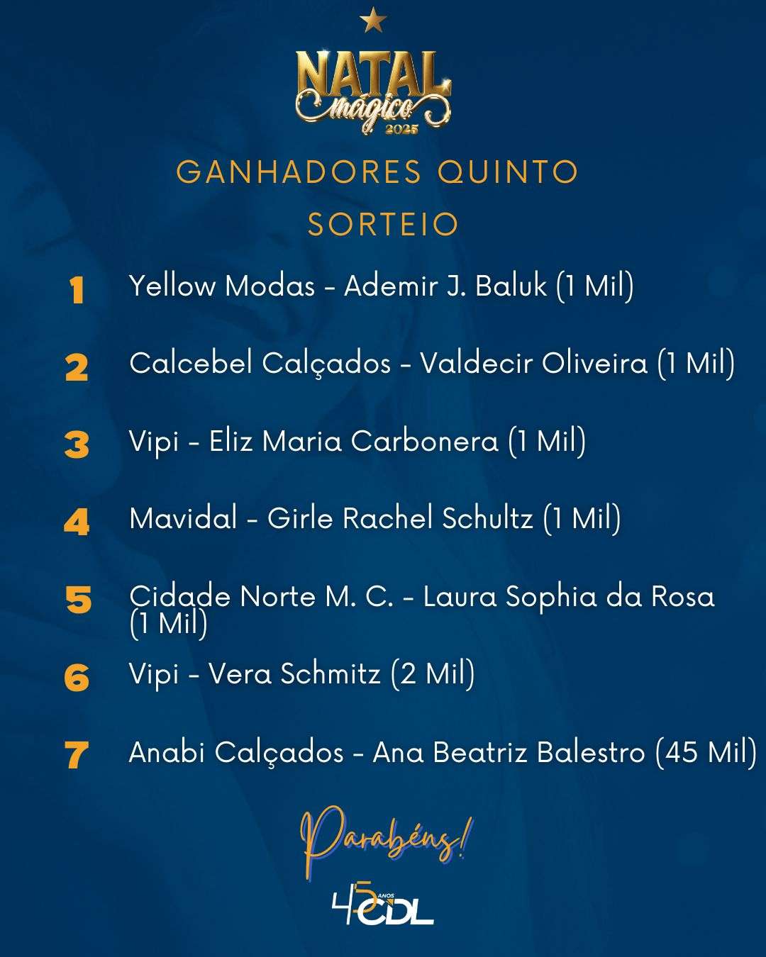 A CDL realizou nesta terça-feira (30) o último sorteio da campanha Natal Premiado, em Francisco Beltrão. Os ganhadores do quinto sorteio do Natal Mágico 2025 já foram divulgados. Ao todo, sete participantes foram contemplados com prêmios em dinheiro, que variam entre R$ 1 mil e R$ 45 mil.