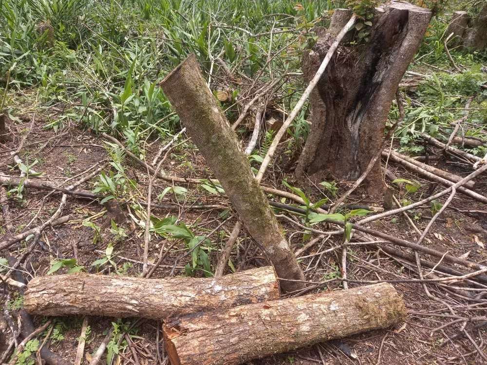 Em outra área, de cerca de 4,65 hectares, foi verificado o corte de espécies nativas como bracatinga, canela e cedro-rosa, restando apenas tocos e troncos no local, para o plantio de eucalipto;