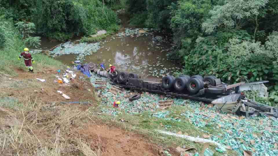 O caminhão, com placas de Ponta Grossa, transportava carga de cervejas em lata e seguia no sentido Ponta Grossa, Imbaú. Após uma curva em declive, o veículo saiu do leito da rodovia, capotou e submergiu parcialmente no Rio Charqueada.