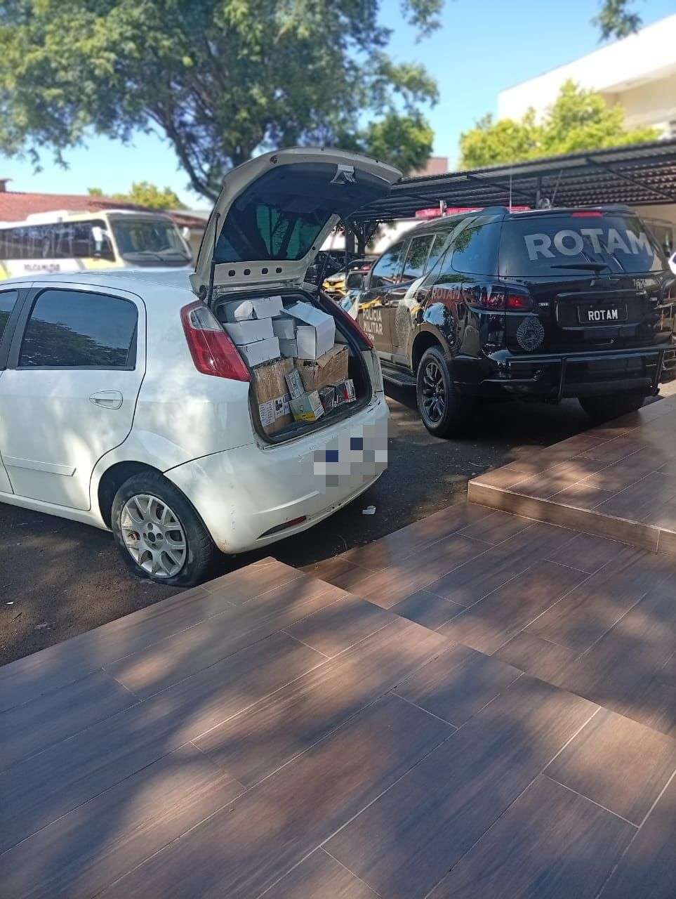 A ação ocorreu durante patrulhamento pela rodovia PR-483, nas proximidades do trevo do bairro Alvorada. Os policiais visualizaram um veículo Fiat Punto com os vidros escuros e a parte traseira excessivamente rebaixada, o que motivou a abordagem.