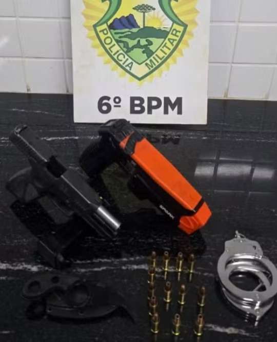 Com ela, a polícia também apreendeu uma arma de choque de propriedade da Guarda Civil de Cascavel, algemas, um canivete e munições.