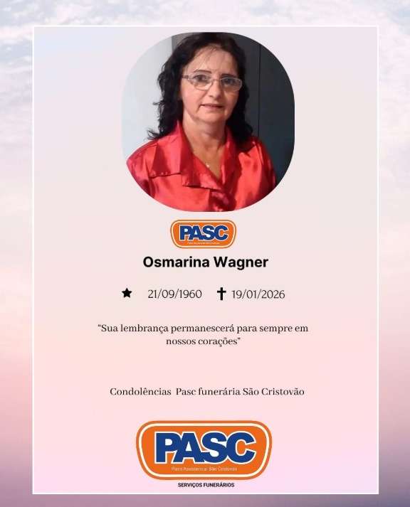 Osmarina Wagner, de 65 anos, faleceu nesta segunda-feira (19), deixando três filhos, quatro netos, uma nora, dois genros, demais familiares e amigos.