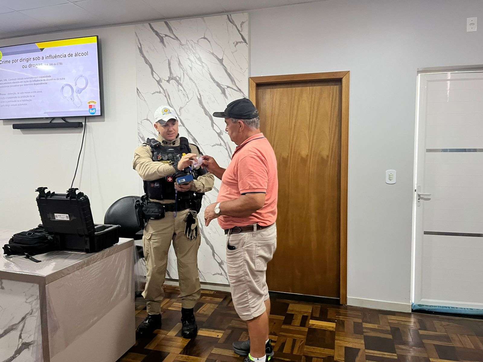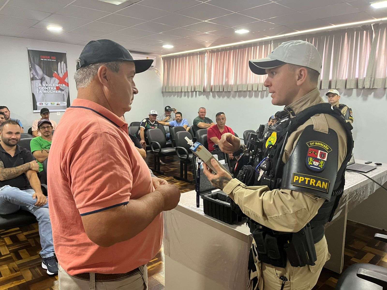 Na manhã desta quinta-feira (29), a equipe do Pelotão de Trânsito do 21º Batalhão da Polícia Militar realizou uma ação educativa em Enéas Marques, como parte do Projeto Vida no Trânsito. A iniciativa contou com a participação de 20 motoristas do transporte escolar do município.