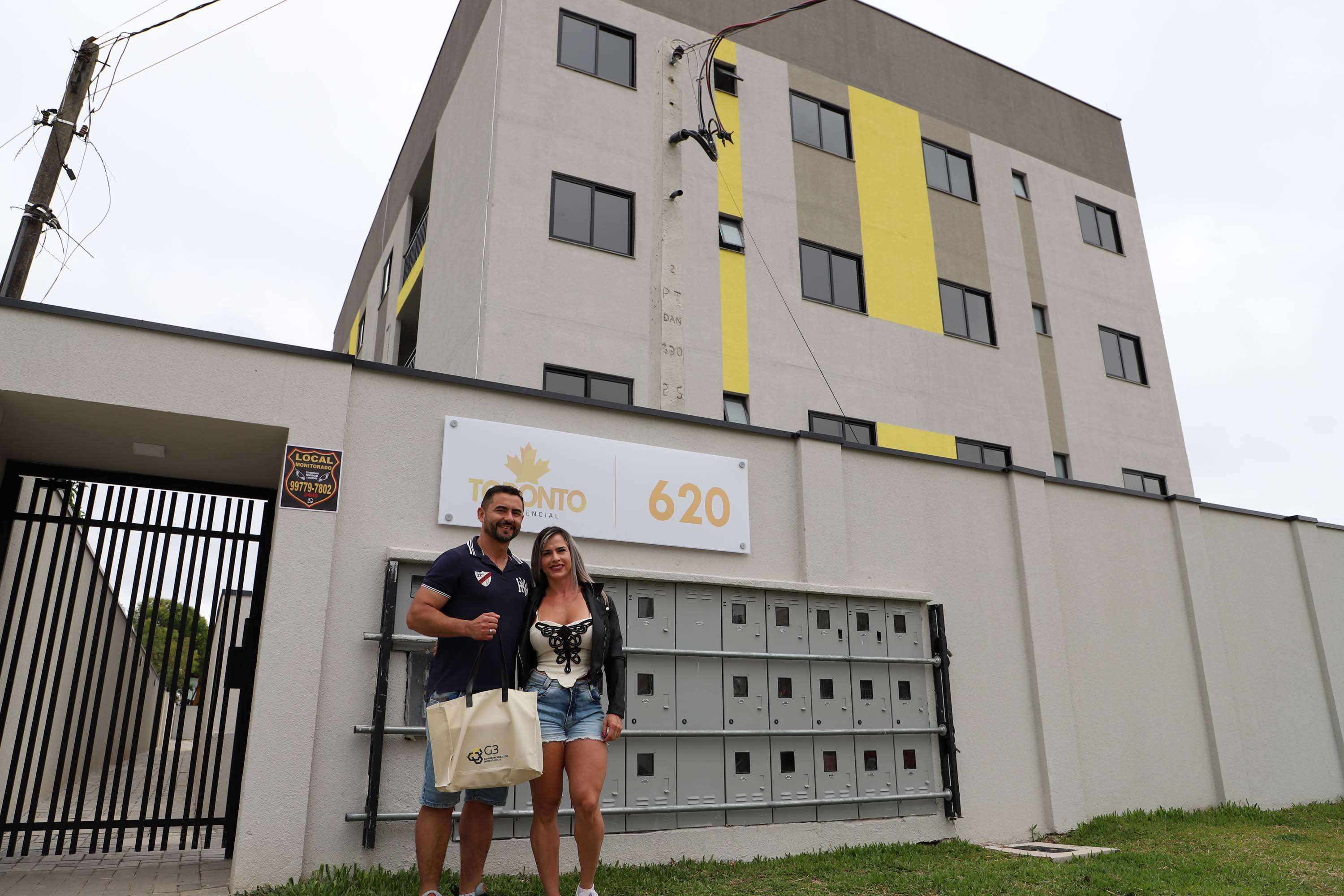 CONCRETIZAÇÃO – O casal de empresários Celso Aguiar e Elisangela Correia Carneiro, de 41 e 38 anos, respectivamente, está na expectativa para mudar de endereço o quanto antes. Eles já moram no bairro, mas em um imóvel alugado. Contemplados com o subsídio do Casa Fácil Paraná, a família agora celebra a conquista da tão sonhada moradia própria.