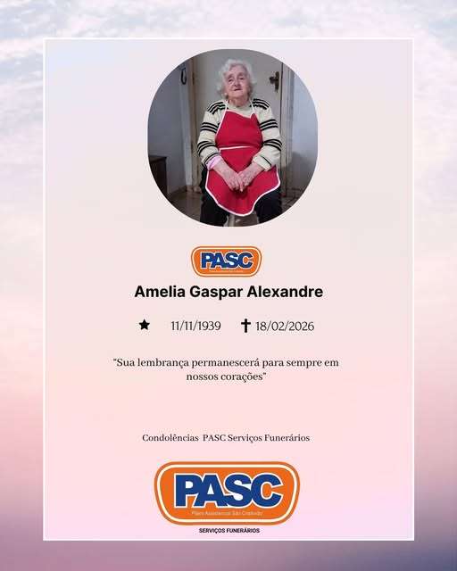 Amelia Gaspar Alexandre, de 86 anos, faleceu nesta quarta-feira (18), deixando irmãos, filhos, netos, bisnetos, demais familiares e amigos.