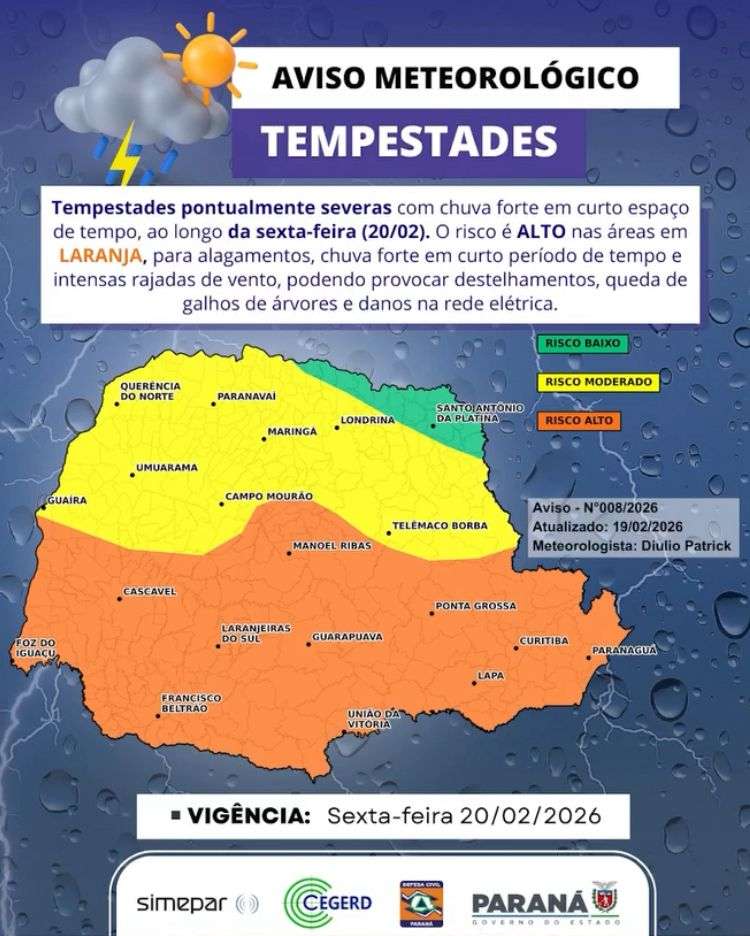 A Defesa Civil do Paraná emitiu um aviso meteorológico para esta sexta-feira (20/02), indicando previsão de tempestades pontualmente severas em várias regiões do estado. O alerta destaca possibilidade de chuva forte em curto período, rajadas intensas de vento e risco elevado para alagamentos.