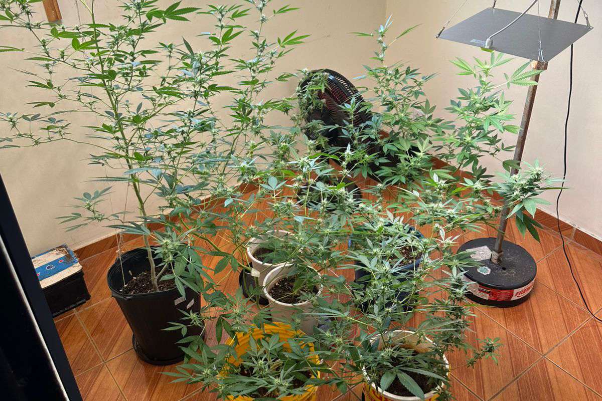 Em uma geladeira, foram encontrados diversos pés de maconha em tamanho pequeno. No andar superior, foi localizada a estufa preparada para o cultivo e vasos com plantas mais desenvolvidas.