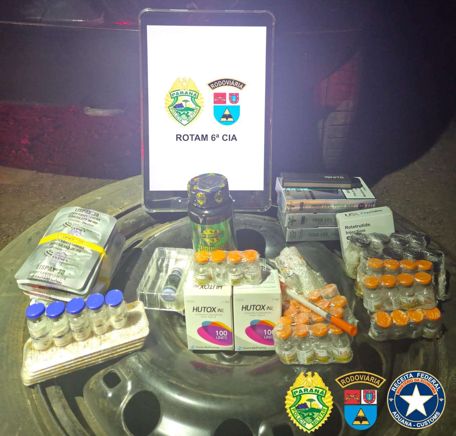 Ao todo, foram apreendidos 31 perfumes e cosméticos, quatro dispositivos eletrônicos do tipo vaper, 36 ampolas de TG 0,5 ml, duas ampolas de trembolona 10 ml, seis ampolas de testosterona 10 ml, cinco ampolas de tirzepatida 3 ml, 60 comprimidos de Lispax 30, 50 comprimidos de clembuterol, 90 comprimidos de turnabol, um frasco de GHK, 200 unidades de Hutox e um frasco de Retratuide 40 mg.
