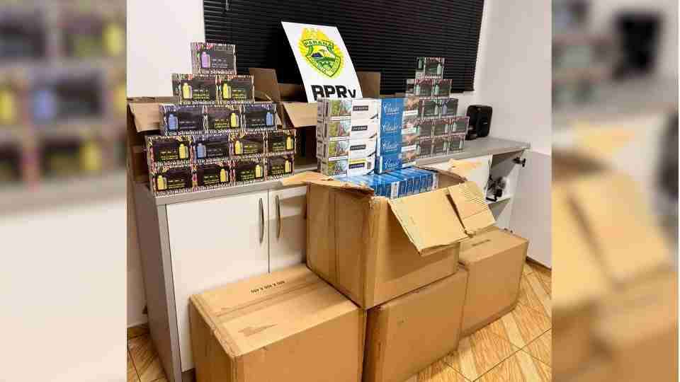 Caixas de cigarros contrabandeados e vapers foram apreendidos na BR-369, Distrito de Ouro Verde do Piquiri em Corbélia, na noite de segunda-feira (2).