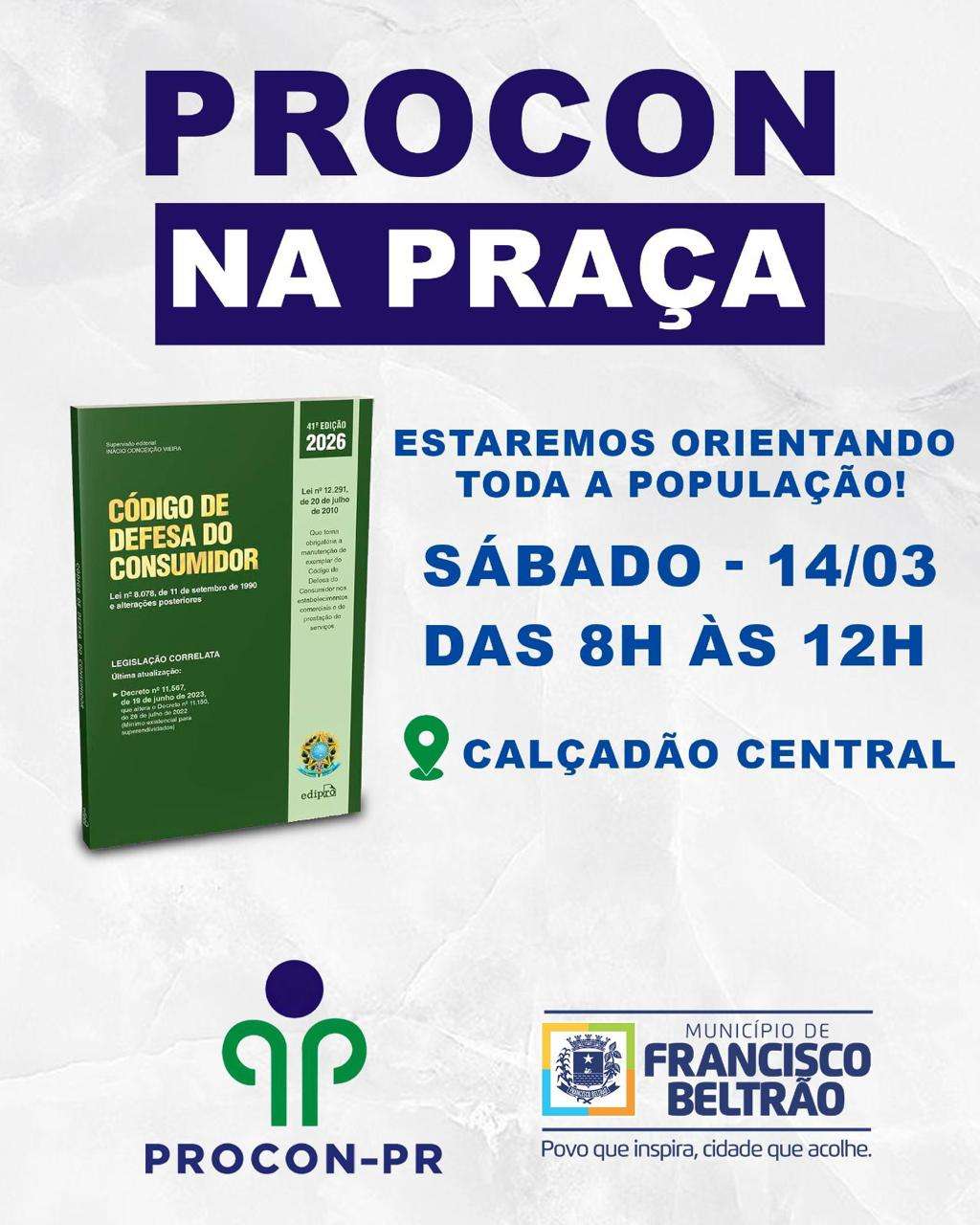 A diretora do Procon de Francisco Beltrão, Pamela Eduarda Castanha Inhoatto, reforça o convite para que a população participe da ação.“Será um momento de orientação e esclarecimento, em que a nossa equipe vai tirar dúvidas sobre o direito do consumidor, orientar sobre compras, cobranças e compras pela internet, além de explicar como é feito o registro de reclamações e denúncias junto ao Procon. Também estaremos distribuindo material informativo para a população. Estaremos na Praça Central no dia 14 de março, sábado pela manhã, das oito ao meio-dia. Contamos com todos lá e estamos à disposição para atender toda a população”, afirma Pamela. A iniciativa tem como objetivo aproximar o Procon da comunidade, ampliar o acesso à informação e fortalecer a defesa dos direitos dos consumidores no município.