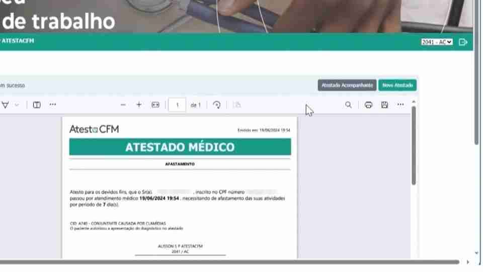 "As empresas reclamaram muito e o Conselho teve que colocar essa obrigatoriedade do atestado, incluindo o nome completo, o CPF do paciente e o CID. Também tem que haver a autorização do paciente, ou seja, tentou-se formatar melhor os atestados médicos, mas a Justiça entrou com uma liminar contra essa decisão do Conselho Federal de Medicina", explicou Lisias Tomé de Araújo, representante do Conselho Regional de Medicina.