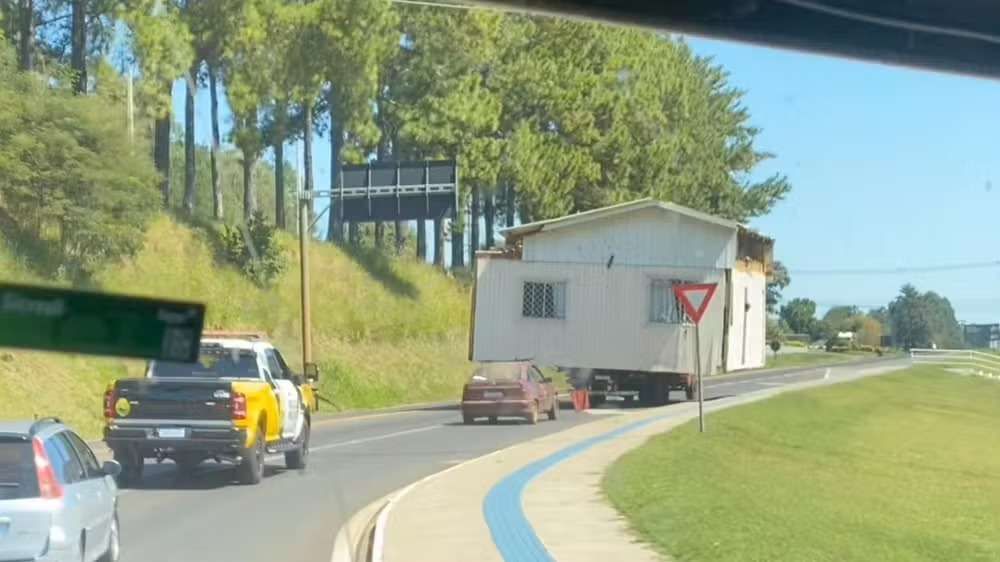 Um motorista foi visto transportando uma casa de madeira na carroceria de um caminhão no trevo entre a PR-180 e a PR-483, em Francisco Beltrão, no sudoeste do Paraná. O vídeo foi gravado no último domingo (29) por um caminhoneiro que passava pela rodovia. Assista acima.
