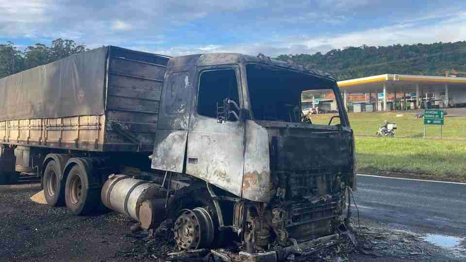 Caminhão foi destruído pelo fogo na tarde desta quarta-feira (1°), no quilômetro 40 da BR 153, em Santo Antônio da Platina.