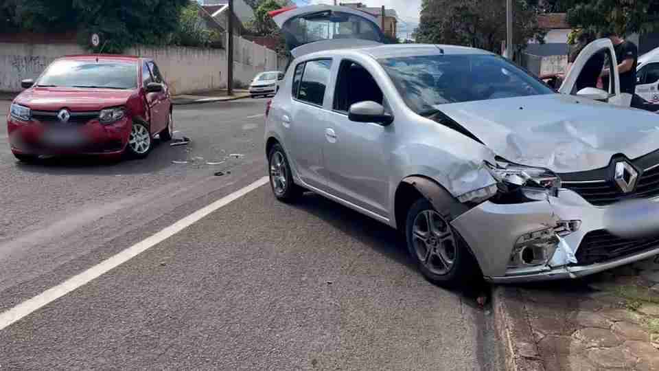 O acidente envolveu dois veículos Renault Sandero, um prata e outro vermelho, no cruzamento das ruas Belo Horizonte e Sete de Setembro.