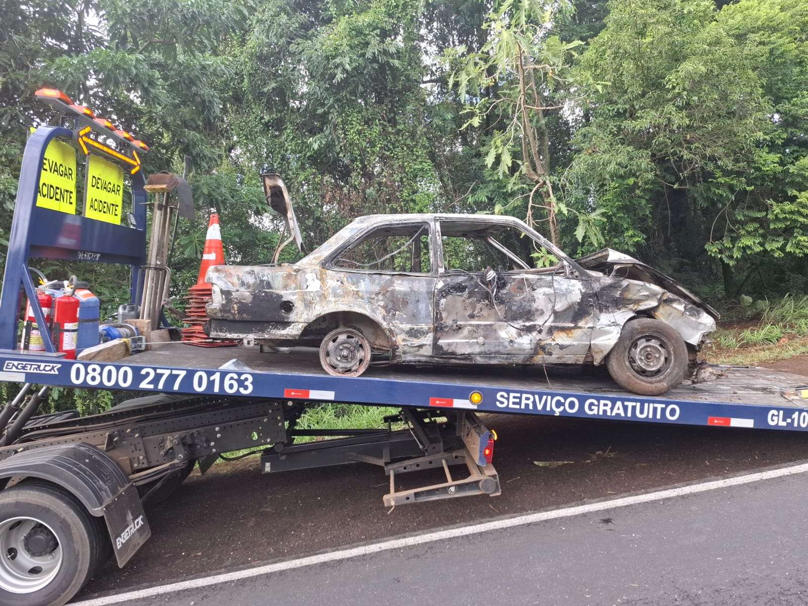 Na sequência, o veículo acabou pegando fogo no local, gerando danos materiais de grande monta. O condutor sofreu ferimentos leves e recebeu atendimento.