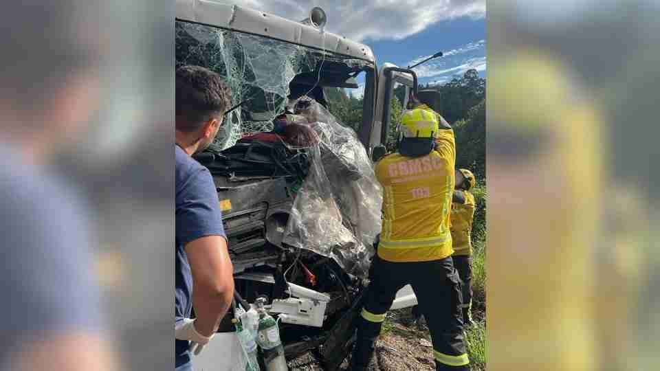 Grave acidente entre dois caminhões deixou pelo menos uma pessoa presa às ferragens na BR-282, em Águas Mornas, na região de Santa Catarina.