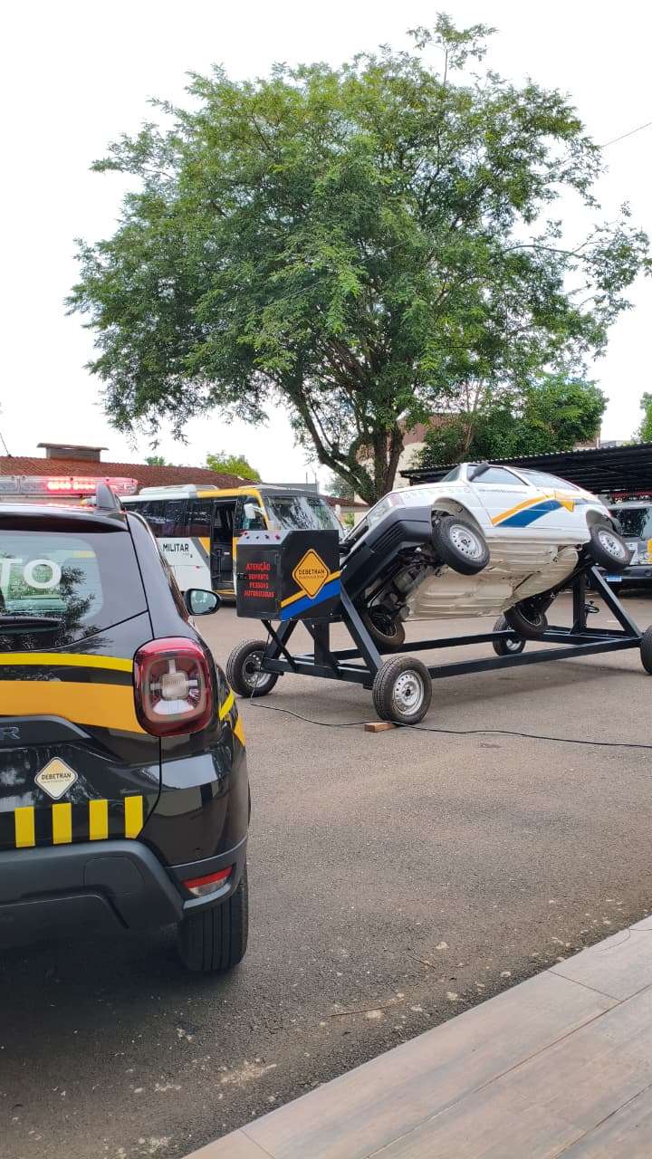 Durante o evento, agentes do Debetran realizaram uma atividade prática com o simulador de capotamento, permitindo que os jovens vivenciassem, de forma controlada, a experiência de um acidente e reforçando a importância do uso do cinto de segurança para a preservação da vida.