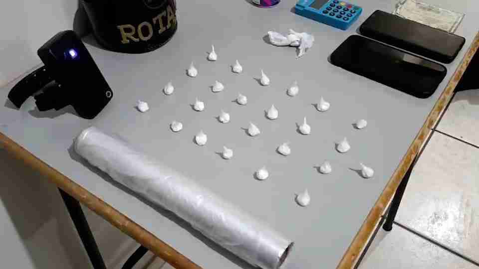 Na casa, os policiais apreenderam cerca de 16,9 gramas de cocaína divididas em 25 porções prontas para venda, além de balança de precisão, máquina de cartão, embalagens, celulares e documentos.