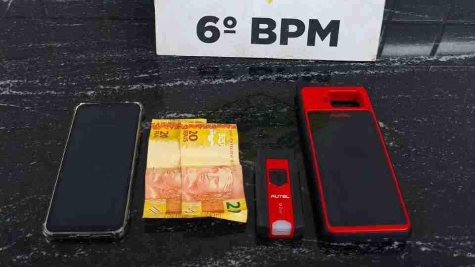 Com as características repassadas, os policiais localizaram o suspeito mexendo na porta do veículo e realizaram a abordagem. Durante a revista pessoal, foi encontrado no bolso um aparelho decodificador, utilizado para ligação automotiva.