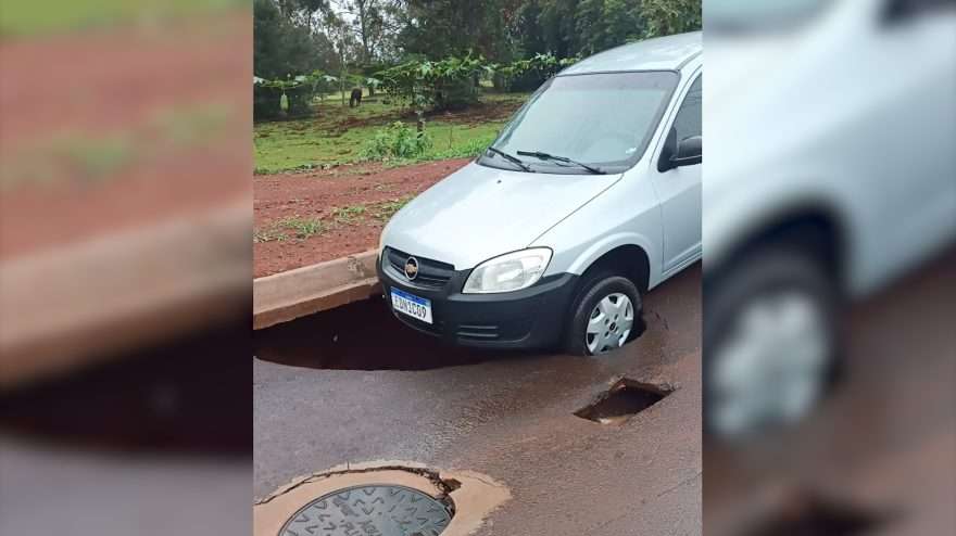 A quantidade de água foi tanta que até a terra embaixo do asfalto cedeu, na tarde desta quarta-feira (29), em Cascavel.