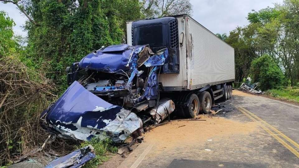 Na parte superior direita da imagem é possível ver o momento que o caminhão, que seguia pela BR-277, e o automóvel, que cruzava a rodovia, batem. Após o impacto, os veículos ficam parados em meio à via.