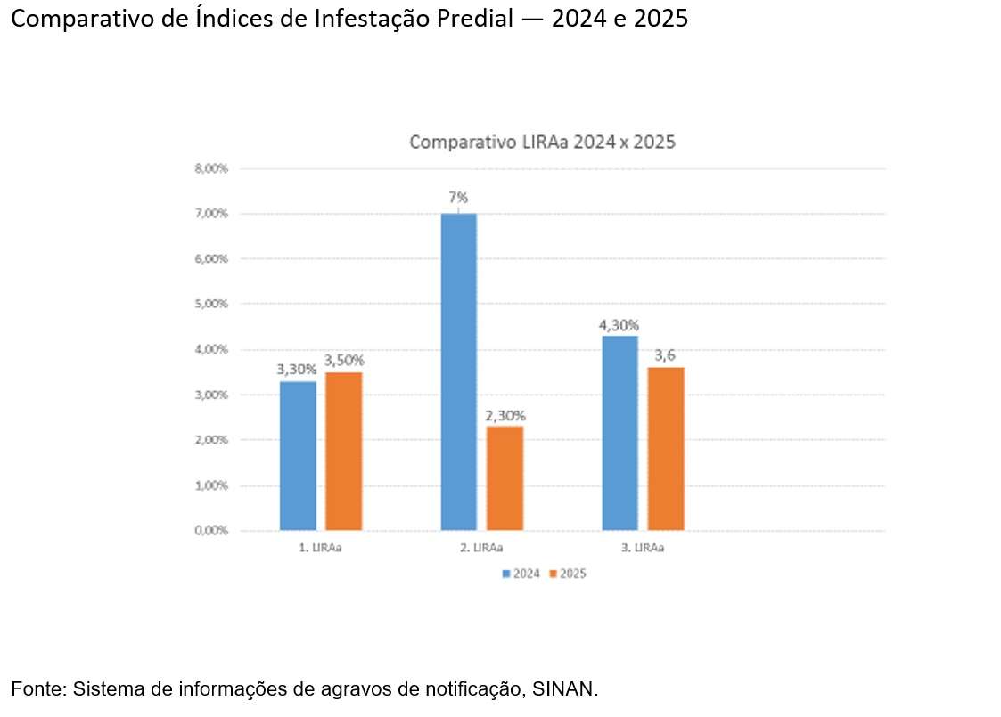 O LIRAa é realizado por meio de visitas amostrais a imóveis residenciais, comerciais e terrenos baldios, em que os agentes de endemias inspecionam possíveis criadouros do mosquito, como recipientes com água parada. Com base nessas amostras, é calculado o Índice de Infestação Predial (IIP), que indica o percentual de imóveis com focos do Aedes aegypti. No mês de maio, o índice ficou 3,6% considerado de médio risco.